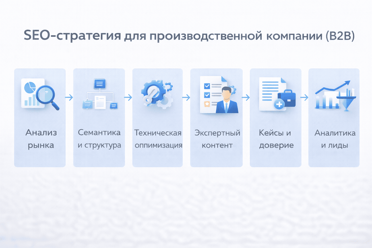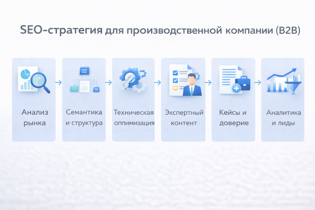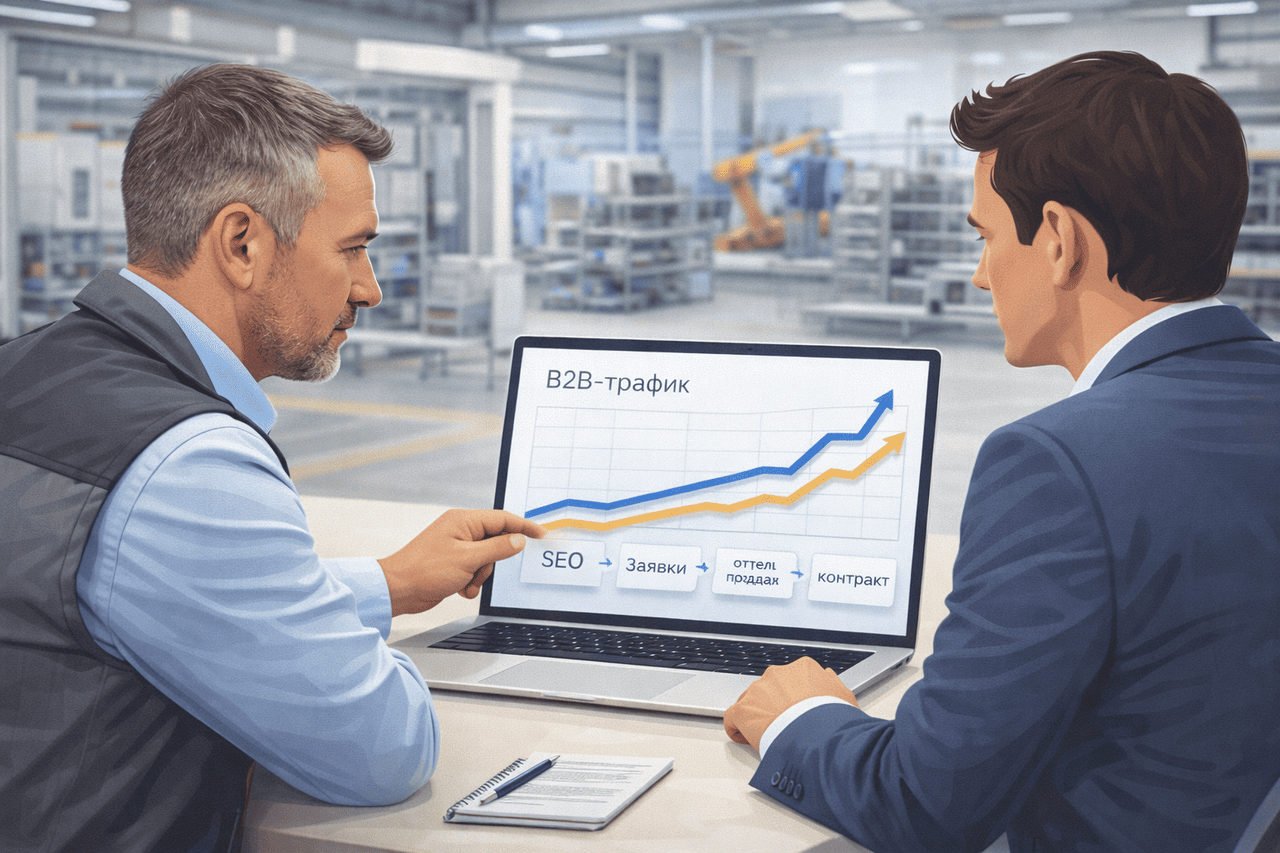 SEO в B2B-производстве отличается от продвижения интернет-магазина или услуг для частных клиентов. Здесь длинный цикл сделки, высокая стоимость контракта и небольшое количество, но ценных лидов. Поэтому задача — не просто привести трафик, а привлечь целевые обращения от закупщиков, инженеров, снабженцев и собственников бизнеса.