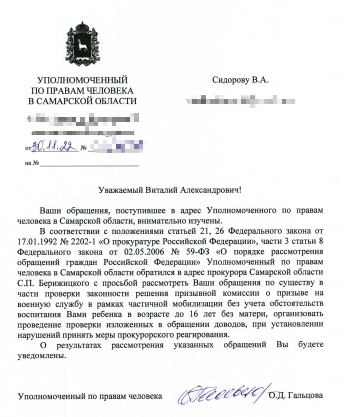 Житель Тольятти обратился к Уполномоченному по правам человека Ольге Гальцовой. В официальном ответе сказано, что в адрес прокурора Самарской области направлено обращение с просьбой рассмотреть законность решения призывной комиссии.