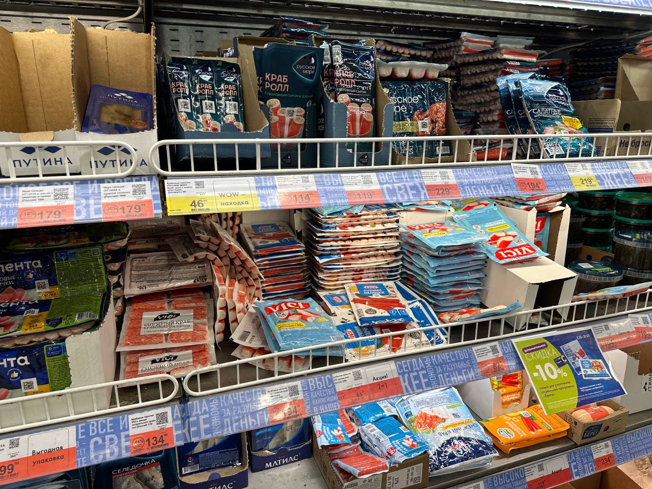 В первую очередь мы начали изучать ассортимент крабовых палочек и другой рыбной продукции. Например, селедочку под шубой от фирмы «Русское море» можно приобрести за 259 рублей, 400 грамм. Крабовые салатные палочки от того же производителя продаются по 119 рублей за 200 грамм. Если вы любите достаточно специфичную закуску в виде ролла из крабовых палочек с сыром и зеленью, то их можно приобрести за 114 рублей, 180 грамм. Крабовые палочки от VICI можно ухватить за 194 рубля, 250 грамм. Есть палочки и не с имитацией краба, а настоящим его мясом. По крайней мере, так заявляет производитель на упаковке. Они продаются по 134 рубля за 170 грамм.