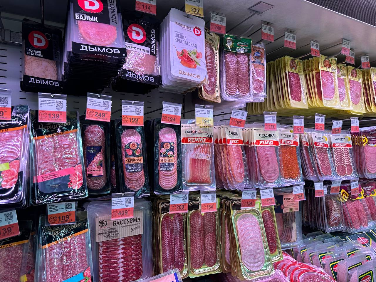 В «Ашане» мы изучили ассортимент копченой колбасы. Кстати, витрина с ней выглядит внушающе. Например, сервелат «Финский» можно приобрести за 273 рубля, 400 грамм. Сервелат царский от «Дым Дымыча» продается по 159 рублей за 350 грамм. Цена колбасы «Владимирский стандарт» составляет 149 рублей за 350 грамм.