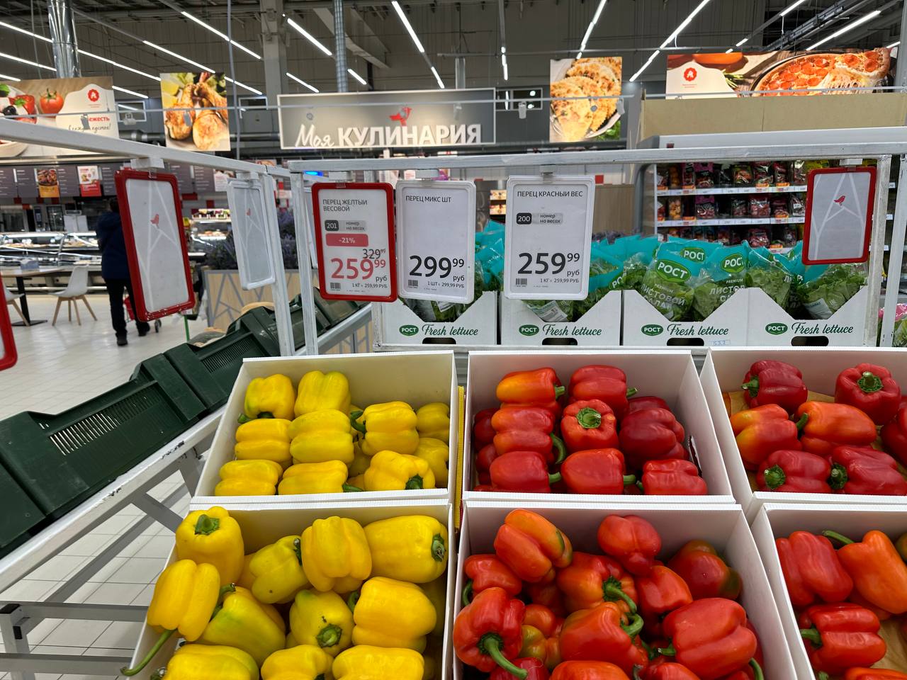 Из овощей на полках сейчас можно найти болгарские перцы разных цветов по: 259 рублей — за желтые, 299 рублей — за красные. Рядом с ними мы увидели томаты и помидорки черри. Если брать на развес, то цена за красные помидоры составит 329 рублей. Черри можно приобрести за 529 рублей. Это стоимость за килограмм.
