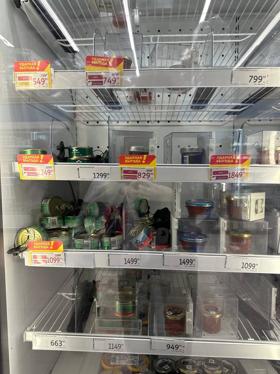 Выбор икры пока небольшой. На полке мы увидели икру горбуши в зеленой жестяной баночке за 1099 рублей, 140 грамм. Слабосоленая икра кеты продается по 1499 рублей за 120 грамм. Варианты черной икры мы не увидели.