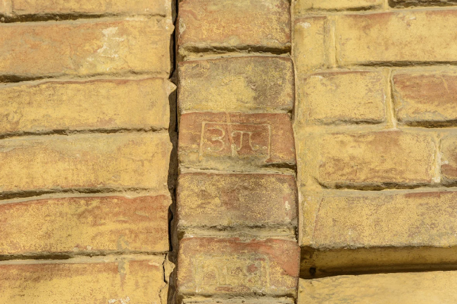 Кирпичное клеймо "ЗП" на стене здания. Кому оно принадлежало - в интернете нашёл два варианта: либо Михаилу Пономаренко, чей кирпичный завод находился в селе Сорочинское Бузулукского уезда Самарской губернии, либо Ивану Плешанову.