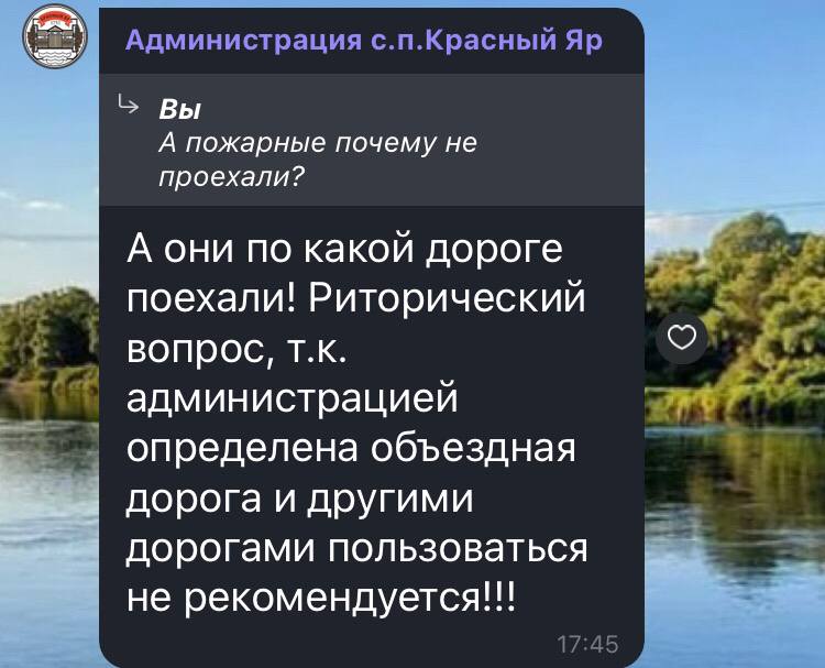 Взволнованные жители посёлка Кириллинский сразу же обратились в администрацию, на что им пришёл такой ответ: «А они [пожарные] по какой дороге поехали?! Риторический вопрос, т.к. администрацией определена объездная дорога и другими дорогами пользоваться не рекомендуется!!!»..jpg)
