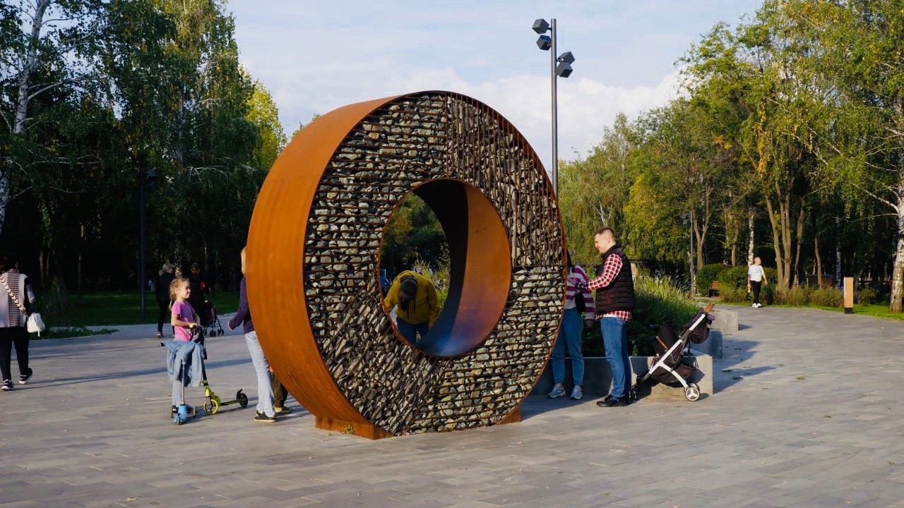 Далее вдоль тротуара расположены инсталляции в виде букв, которые установили здесь еще при открытии парка после первого этапа благоустройства. Около них можно сделать фото, на каких-то буквах люди отдыхают.