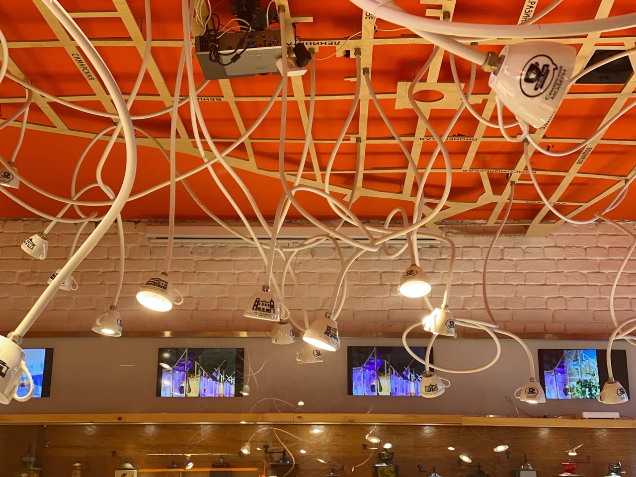 Ещё один необычный предмет интерьера, который вызывает восторг у каждого гостя кофейни, – потолок, который представляет из себя карту города. На ней отмечены памятники модерна, а для наглядности с потолка свисают чашки-светильники с их изображением.