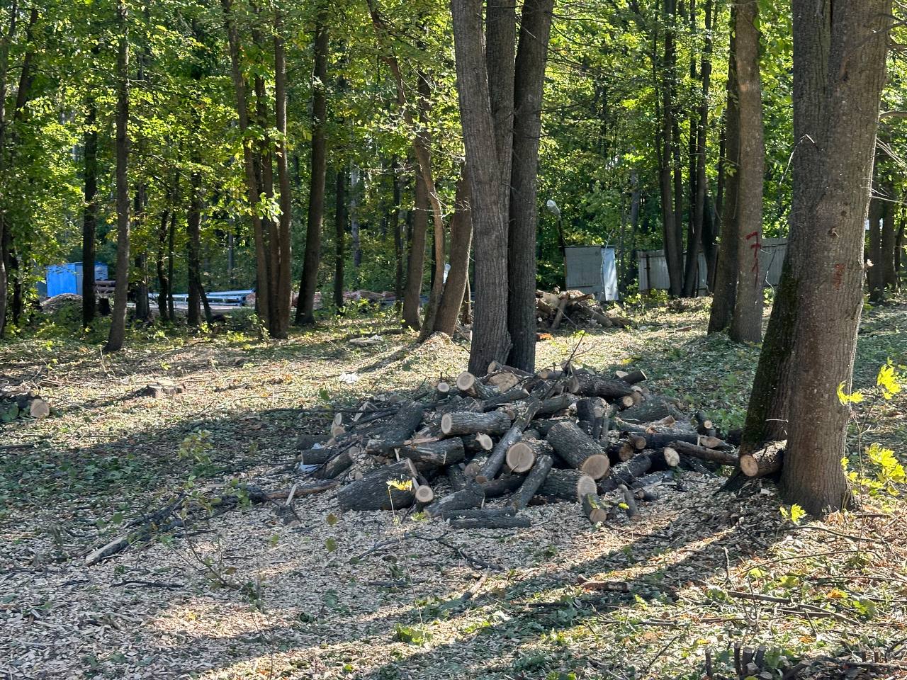 Вырубка деревьев также идет. Об этом свидетельствуют груды бревен, перемешанные с мусором, которые мы обнаружили перед входом на площадку. На саму территорию мы не стали заходить в целях безопасности.