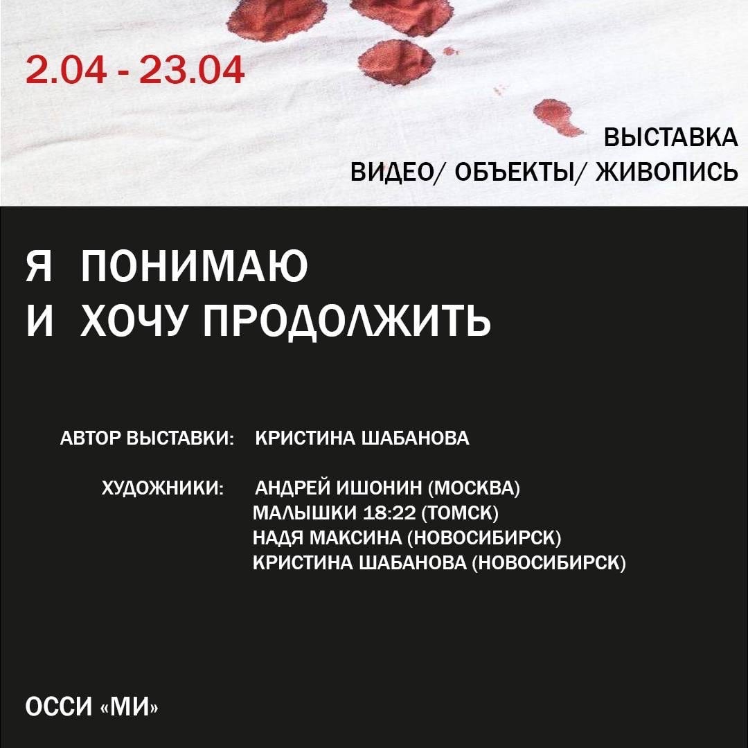 - Со 2 по 23 апреля будет открыта выставка "Я понимаю и хочу продолжить" cибирских художников. В рамках выставки будут проведены ряд образовательных мероприятий, связанных осмыслением темы насилия с помощью критических текстов философов и встреча с куратором, который расскажет про выставку.