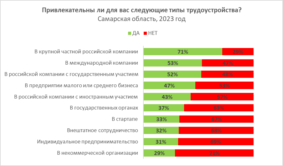 На первом месте по привлекательности трудоустройства оказались крупные частные российские компании: 71% соискателей из Самарской области предпочли бы именно такого работодателя. Чаще всего этот вариант интересует юристов (82%), строителей (78%) и специалистов по консалтингу и инвестициям (77%).