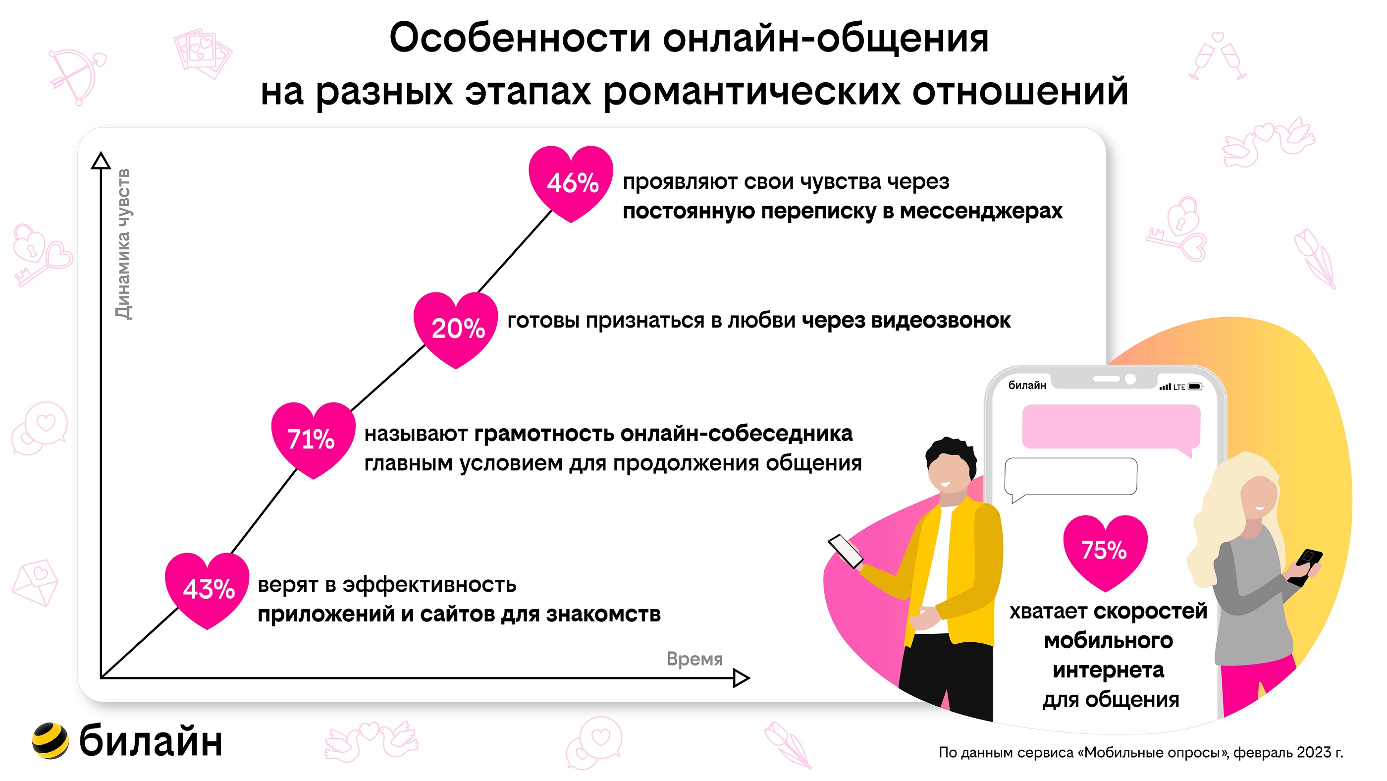 Качественный мобильный интернет и смартфоны помогают найти вторую половинку. Оператор билайн проанализировал особенности онлайн-общения жителей Самары на разных этапах развития отношений – при знакомстве, в начале романтических отношений, в момент признания в любви, в поддержке чувств на расстоянии, а также в дарении подарков, в том числе на 8 Марта. О роли онлайн-общения билайн узнал у своих клиентов с помощью собственного сервиса исследований «Мобильные опросы»*.