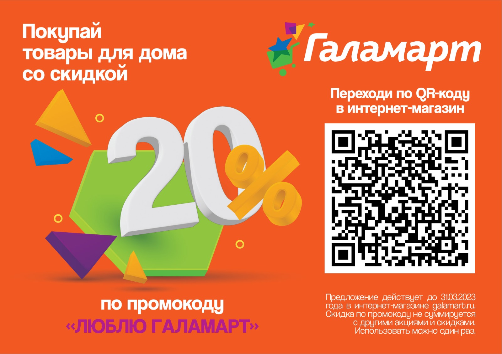 **Промокод «ЛЮБЛЮ ГАЛАМАРТ» действует до 31.03.2023 года в интернет-магазине galamart.ru. Скидка по промокоду не суммируется с другими акциями и скидками. Использовать можно один раз.