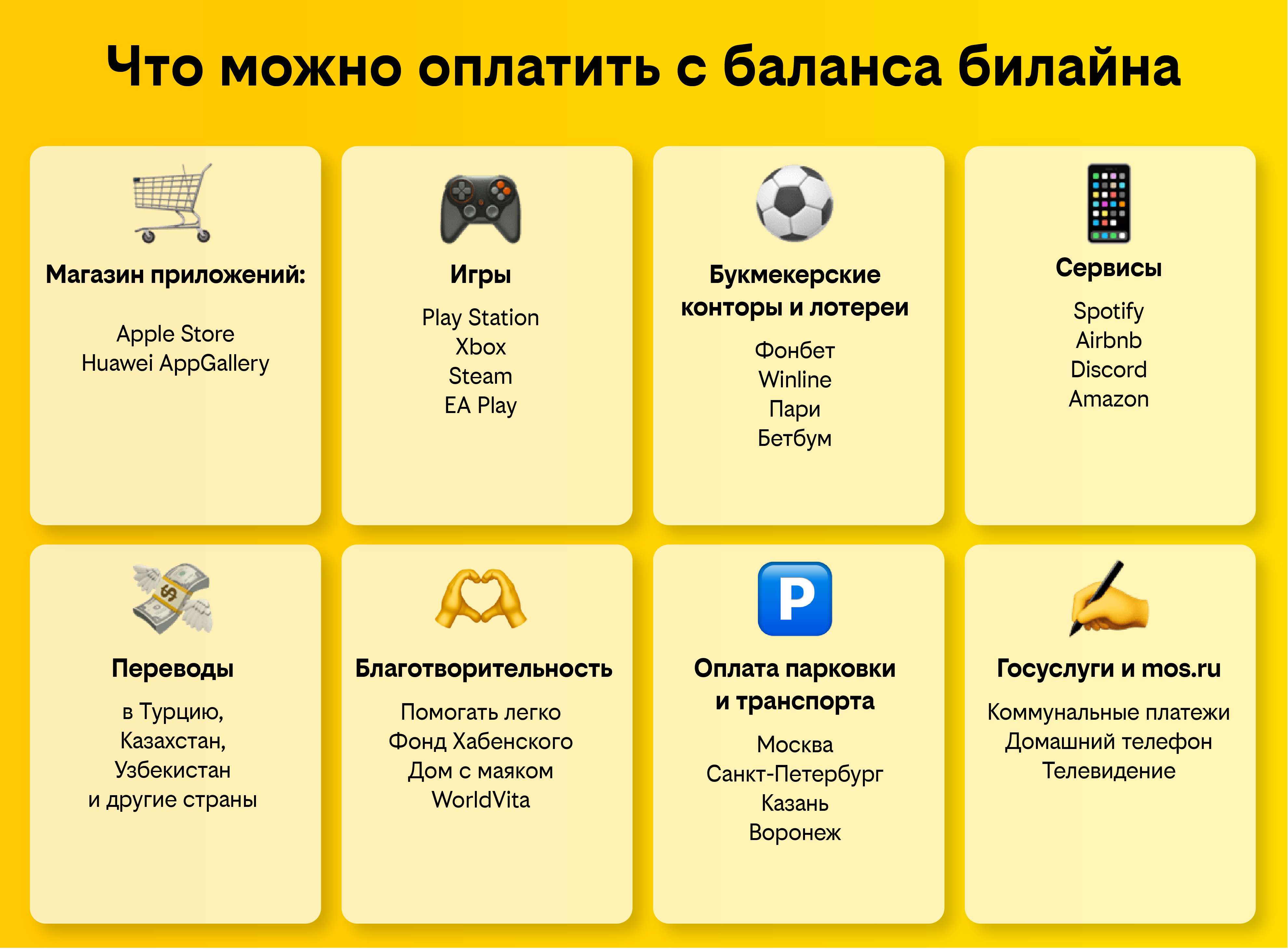 Что именно сегодня можно оплатить с баланса билайна? Показываем для наглядности на одной картинке.