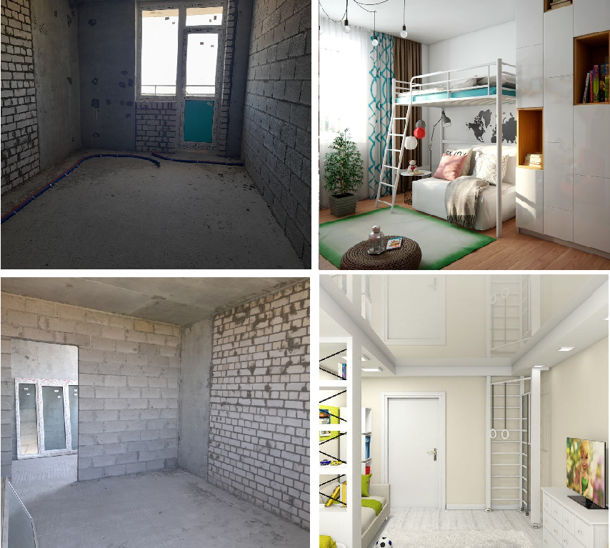 Помним, что нужно уместить кровать, рабочий стол, шкафы, да еще и шведскую стенку для тренировок, так что места нужно много.
