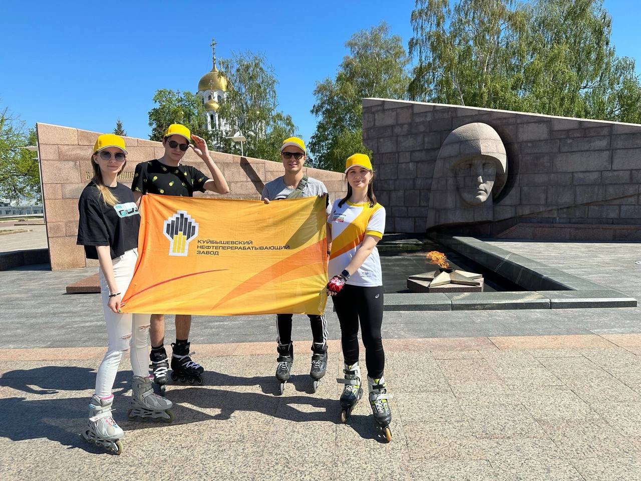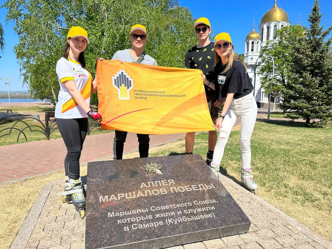В преддверии Дня Победы молодежь Куйбышевского нефтеперерабатывающего завода встала на ролики, чтобы отдать дань уважения памяти своих земляков. Строго говоря, для этого им и далеко ходить не надо, ведь сам завод – живой свидетель трудового подвига: возведенный в тяжелейшие годы войны и ровесник Победы. В этом году молодые специалисты составили маршрут по центру города, стартовав от мемориального комплекса «Скорбящая Мать-Родина». От вечного огня, который горит, не угасая, в память обо всех, отдавших свои жизни за Отечество, ребята отправились на Аллею маршалов Победы, которые служили в нашем городе.