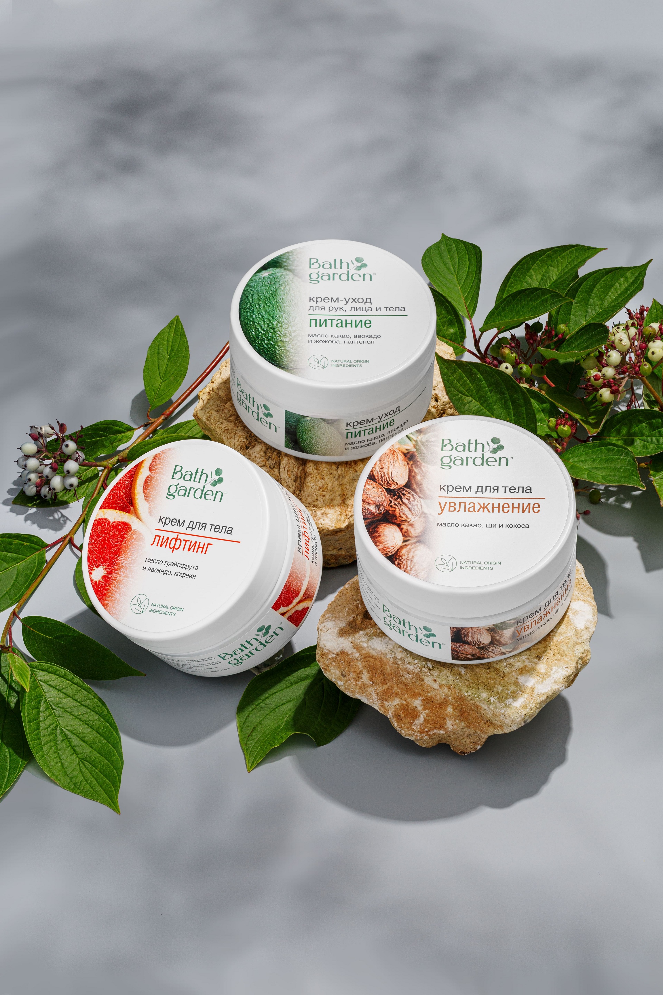 Необходимо отдельно упомянуть о новом универсальном креме "Питание" с маслами какао, авокадо, жожоба и пантенолом, который прекрасно подходит для ухода за кожей лица, рук и тела. Большим плюсом являются крема для тела в новой линии Bath Garden: "Лифтинг", "Увлажнение". Первый направлен на подтягивающий эффект благодаря высокому содержанию кофеина, масел грейпфрута и авокадо, а также эффективно борется с нежелательным целлюлитом. Второй идеально подходит для ухода за обезвоженной кожей, его главные компоненты – масла какао, ши и кокоса, обеспечивают увлажнение и питание.