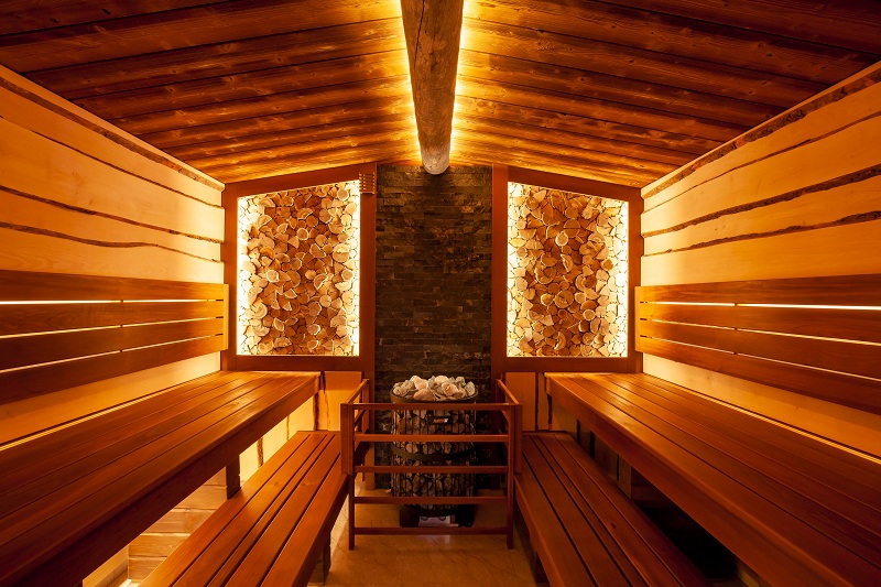 Соляная сауна - современная адаптация пещер со стенами из соли, микрочастицы которой очищают дыхательные пути и омолаживают кожу. В отделке также используется панно из можжевельника, которое окутывает приятным хвойный запахом.