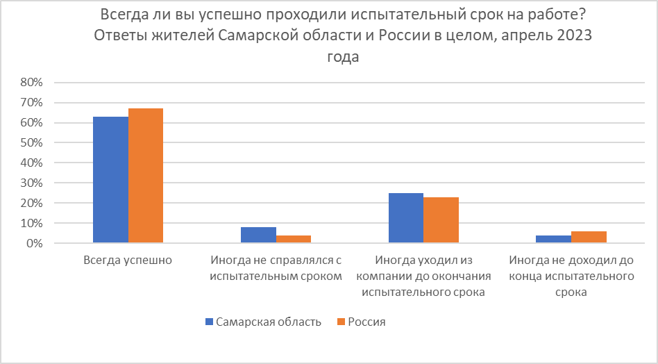 Исследование hh.ru показало: только 63% респондентов из Самарской области успешно проходят испытательный срок при трудоустройстве. Для сравнения, такой ответ дали 67% жителей регионов России в целом. Также самарцы чаще покидают компанию из-за того, что не справились с требованиями работодателя.