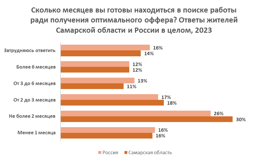 Согласно результатам исследования, 30% жителей региона не готовы находиться в поиске работы более двух месяцев. Для сравнения, такой ответ дали только 26% россиян в целом. А вот по самым большим — от полугода — и самым маленьким срокам трудоустройства — до месяца — ответы самарцев и россиян в целом идентичны.