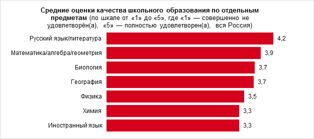 Среди предметов наиболее высокую оценку со стороны соискателей получили русский язык и литература (4,2 балла из 5), а также математика (3,9 балла из 5). Наиболее низкую удовлетворённость качеством преподавания предмета получили иностранный язык и химия (по 3,3 балла).