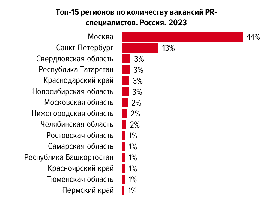 В топ-5 регионов, где чаще всего требуются пиарщики, входят Москва (44% всех вакансий), Санкт-Петербург (13%), Свердловская область, Татарстан и Краснодарский край (по 3%). Самарская область находится на 11 месте. В июне в целом по стране было размещено более 37 тысяч вакансий для профессионалов в сфере рекламы, маркетинга и PR.