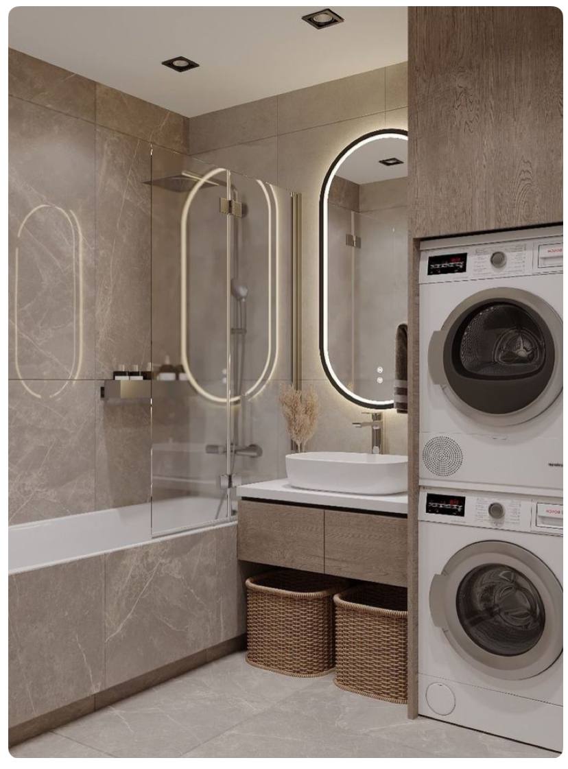 Тренд на глубокие и темные оттенки не обошел стороной и ванные комнаты. Черный, графитовый, темно-синий в сочетании с латунью или хромом придают интерьеру дорогой и завершенный вид. Простор позволяет разместить и технику, и зоны хранения — это делает санузел не только стильным, но и функциональным.
