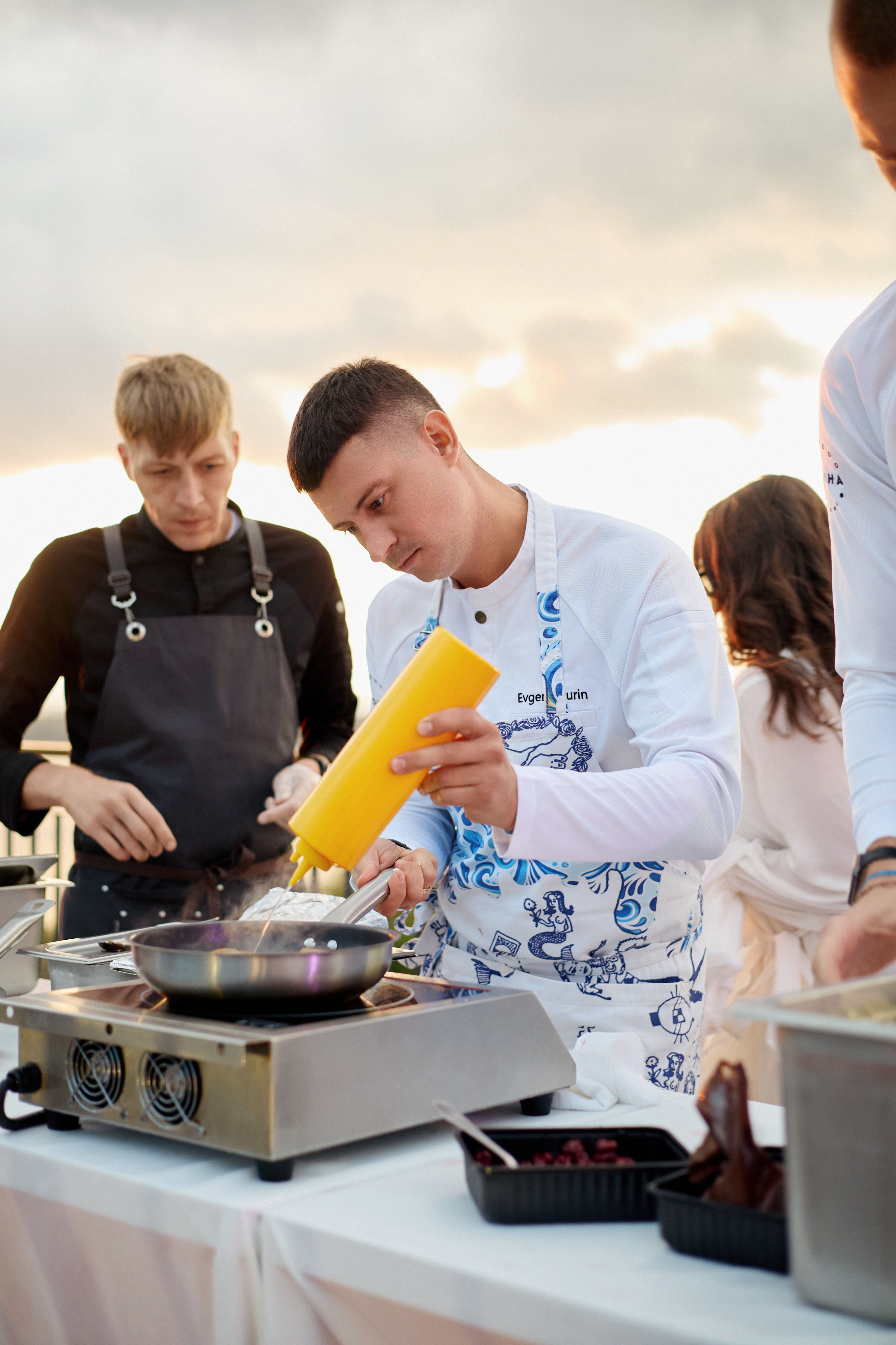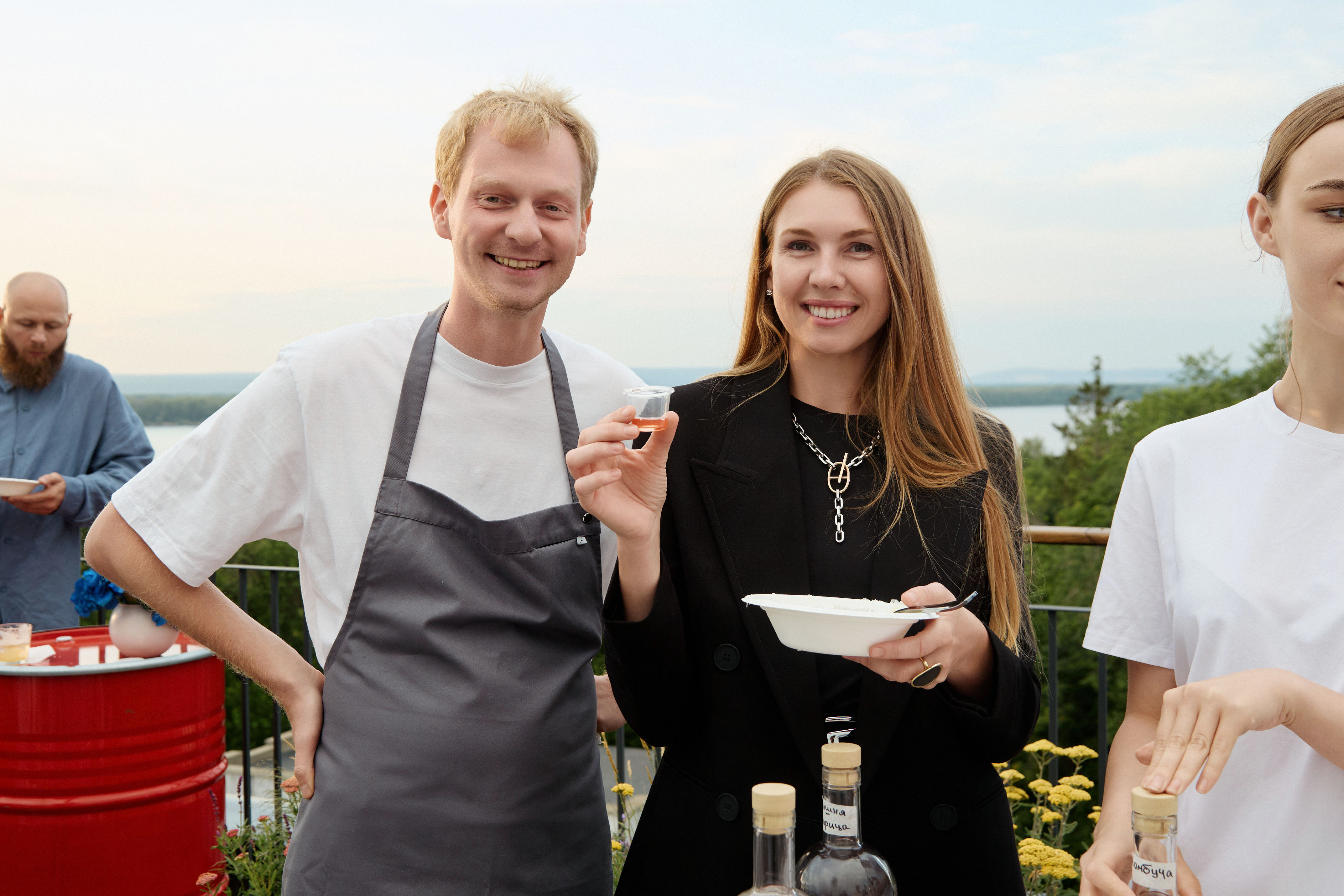 С приветственным словом к гостям обратились директор по стратегическому маркетингу и развитию «Ресторанной компании Поляна», вдохновительница и соавтор юбилейного фестиваля «Волжские сезоны» Женя Кручинина и бренд-шефы «Ресторанной компании Поляна» и идеологи фестиваля Евгений Гурин и Андрей Рогачёв.