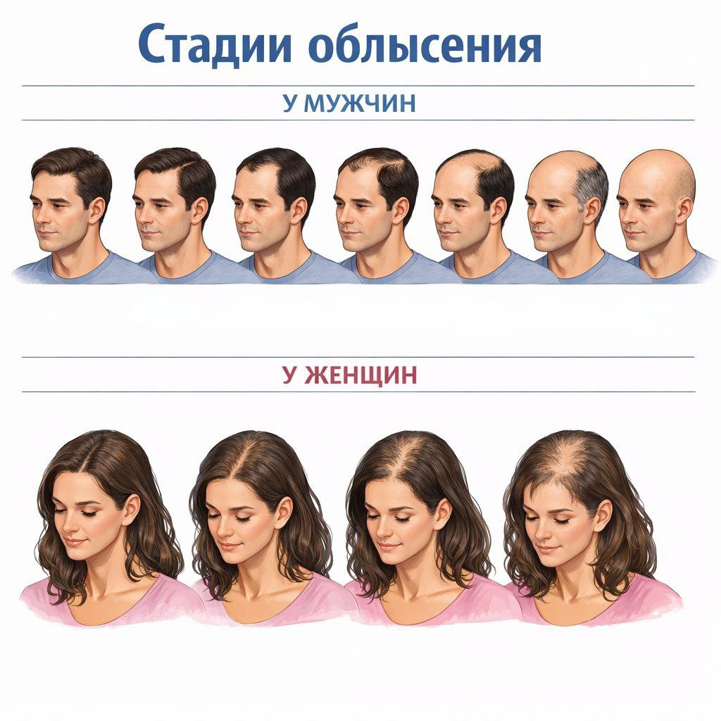 У женщин ситуация сложнее. Волосы у них выпадают не в зоне лба или на макушке, как у мужчин, а по пробору. Стадий всего четыре, но выглядят они иначе. Кроме того, пересадка волос у женщин возможна только после менопаузы – до этого врач работает с терапией и наблюдением.