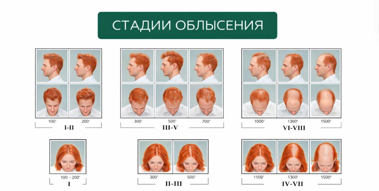 Стадии облысения у мужчин и женщин разные. У мужчин их семь. На первой стадии пересадка часто делается не из-за невозможности лечения, а из-за эстетики – например, чтобы скорректировать линию роста волос и визуально уменьшить высокий лоб. А вот последующие стадии чаще всего требуют хирургического вмешательства: чем выше стадия, тем больше объем работы и тем больше графтов нужно, чтобы закрыть зону потери волос.